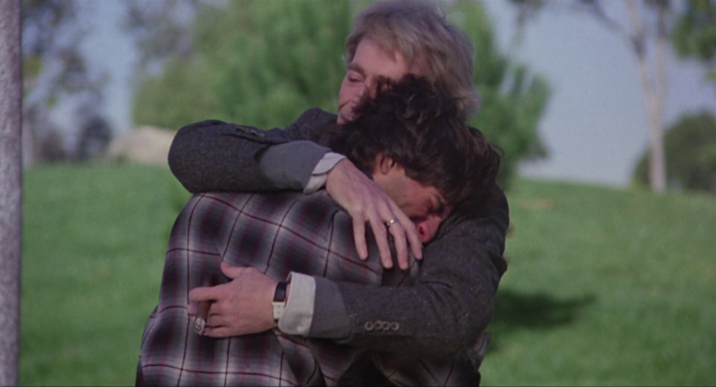 E alla fine Barbara si sveglia. All’ultimo momento, come prevedibile in un film così. E quando Boris esce dall’ospedale, Harry è lì, su una panchina, ad aspettarlo. E lo sguardo in questa immagine dice tutto. Perché Harry conosce il dolore che avrebbe atteso Boris e vederlo “salvo” in qualche modo salva anche lui, perché quel dolore non si augura a nessuno, soprattutto a qualcuno che ami come un figlio. L’inizio di questo post mostra l’abbraccio subito dopo, per dire.